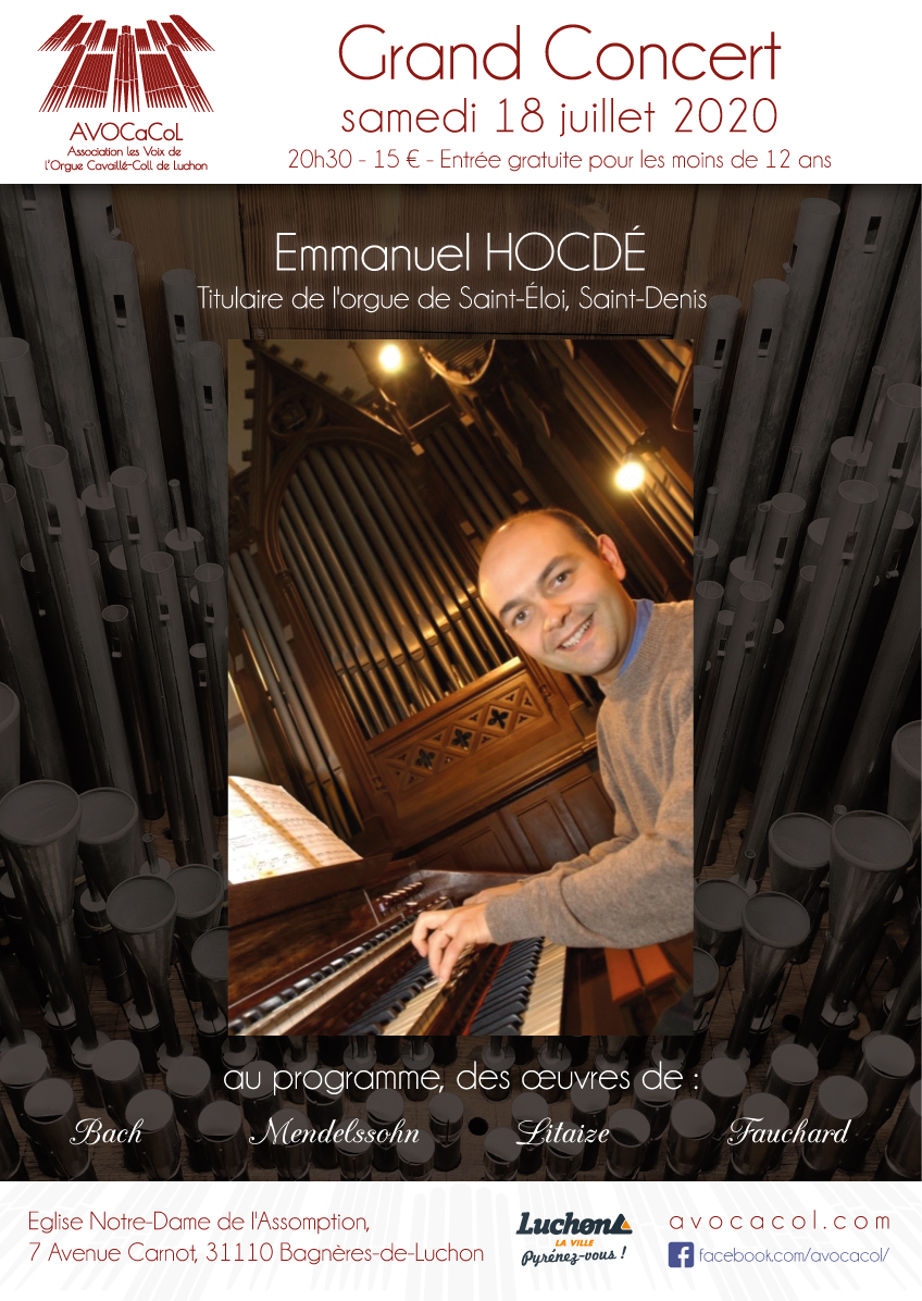 Emmanuel Hocdé est né en 1970 Château-Gontier en Mayenne. Il étudie l’orgue au Conservatoire National de Région de St Maur des Fossés dans la classe de Gaston Litaize où il obtient une médaille d’or en 1990, puis ensuite dans la classe d’Olivier Latry.