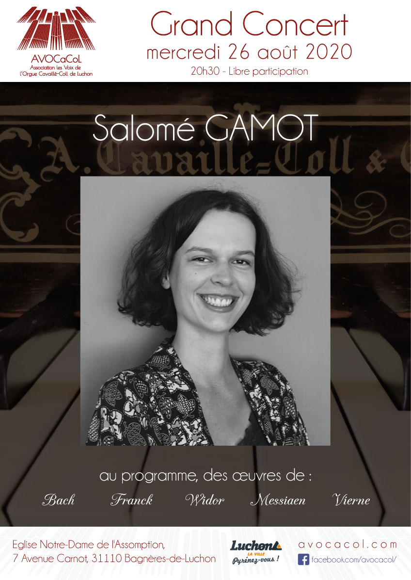 Intéressée par la pédagogie et par l’enseignement, Salomé est titulaire de deux Diplômes d’Etat (DE) de professeur de piano et d’orgue. Actuellement, Salomé est en master d’orgue au Conservatoire Royal de Bruxelles dans la classe de Benoît Mernier.
