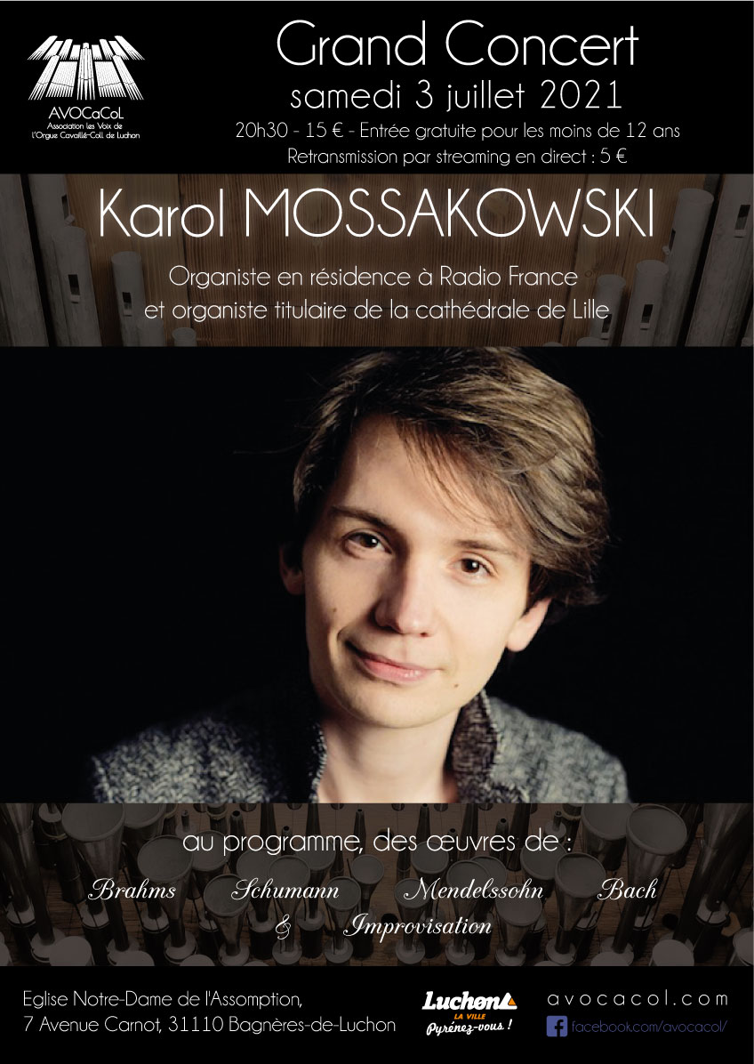 Karol Mossakowskiest reconnu tant pour ses qualités d’interprète que d’improvisateur. Premier prix du Printemps de Prague et Grand Prix de Chartres, il mène une carrière internationale très active dans ces deux champs qu’il ne cesse de nourrir mutuellement. Organiste en résidence à Radio France dès septembre 2019, ses nombreux concerts et interventions emportent l’adhésion du public grâce à un charisme indéniable.
