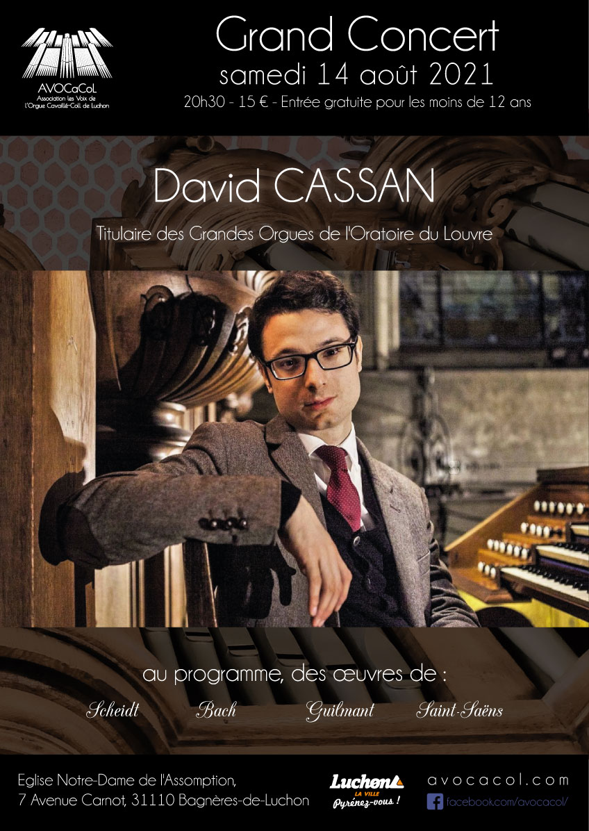 Musicien éclectique à la réputation internationale, David Cassan fait partie des personnalités marquantes de la jeune génération des organistes français. Formé au Conservatoire de Caen et aux Conservatoires Nationaux Supérieurs de Musique de Paris et de Lyon auprès de Thierry Escaich, Pierre Pincemaille, Philippe Lefebvre, François Espinasse, Jean-François Zygel et Erwan Le Prado, il poursuit aujourd’hui une carrière de soliste qui l’amène à se produire en compagnie d’ensembles prestigieux (Orchestre Philharmonique de Paris, Orchestre National de Lyon, Capitole de Toulouse, Chœur et Orchestre Symphonique de Paris) et ce dans de nombreux lieux en France et à l’étranger (Allemagne, Angleterre, Russie, Chine, Israël, Lettonie, Estonie, Espagne, Islande, Uruguay, Pays-Bas, Irlande, Portugal, République Tchèque, Luxembourg, Belgique, Italie, Suisse).