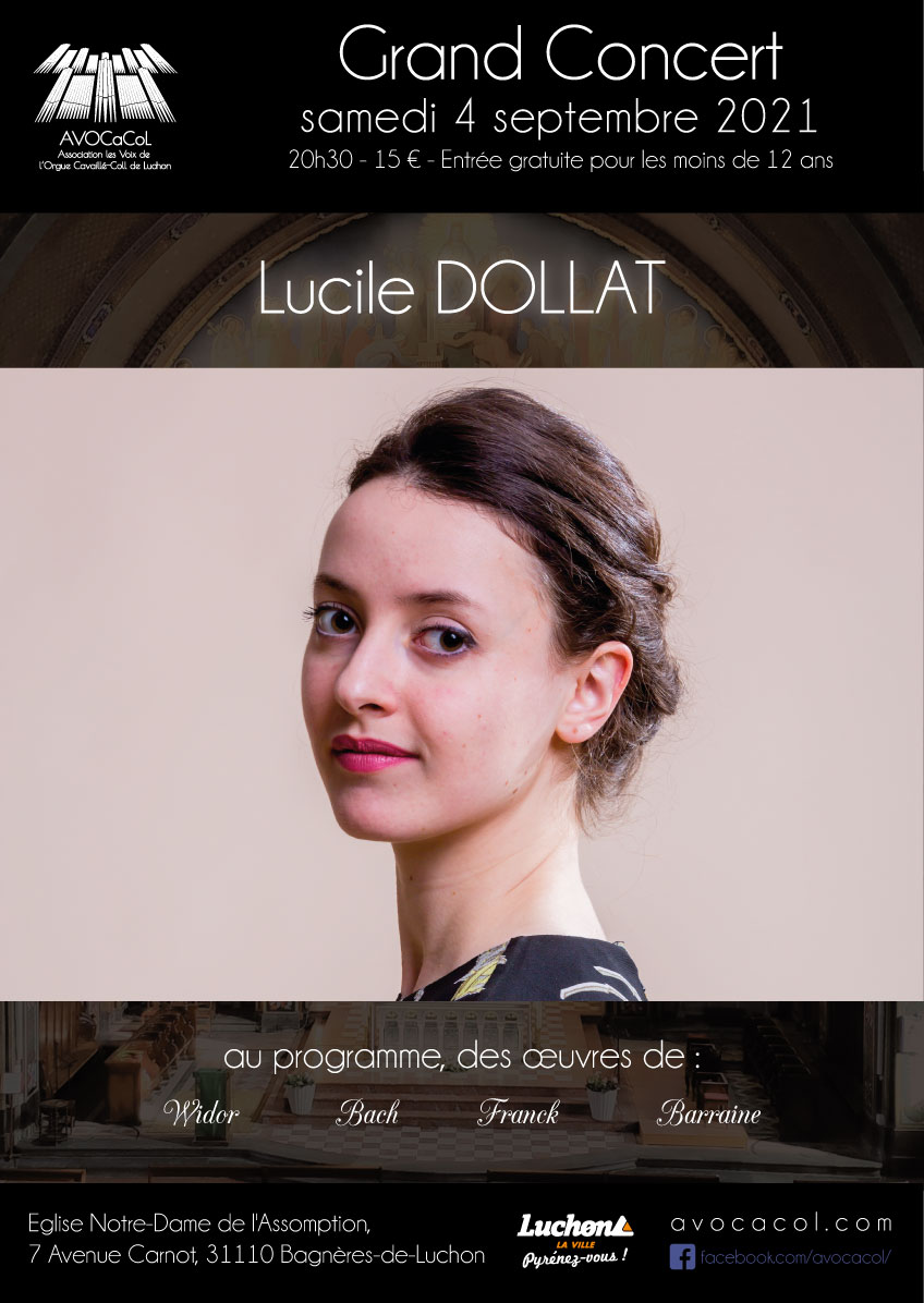 Lucile Dollat a déjà remporté plusieurs prix de Concours Internationaux, entre autres le Grand Prix et le Prix du Public du Concours International d’Orgue André Marchal - Gaston Litaize (Paris, 2017), le Second Prix du Concours International d’Orgue « Pierre de Manchicourt » de Béthune - Saint-Omer (2016)… Diplômée en orgue et en improvisation à l’orgue au Conservatoire Saint-Maur-des-Fossés, elle poursuit ses études au Conservatoire National Supérieur de Musique et de Danse de Paris en orgue auprès d’Olivier Latry et Michel Bouvard, en improvisation auprès de Thierry Escaich et Laszlo Fassang, et en écriture. En juin 2018, elle obtient son Diplôme National Supérieur de Musicien Professionnel en orgue avec la plus haute distinction, ainsi qu’un Prix d’Harmonie et un Prix de Contrepoint. En Juin 2020, elle obtient son Master d’orgue-interprétation mention Très Bien. Lucile mène une carrière de concertiste à travers l’Europe. Elle interprète un répertoire allant du XVIe siècle à nos jours et a une volonté toute particulière de mêler l’orgue à diverses formations instrumentales et d’autres formes d’Art. Lucile se produit tant en soliste qu’avec d’autres formations : elle a notamment joué avec l’Ensemble Intercontemporain à la Philharmonie de Paris, l’Orchestre de Chambre de Paris, le chœur les Métaboles… Lucile est organiste titulaire de l’orgue Cavaillé-Coll de l’église Notre Dame de la Gare (Paris XIIIe), de l’orgue historique de l’église Notre-Dame des Vertus (Aubervilliers), et du grand-orgue symphonique Abbey de l’église Saint-Vincent de Paul (Clichy-La-Garenne). Lucile bénéficie du soutien de la Fondation de France et du Mécénat Musical Société Générale.