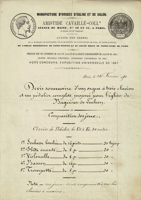 Aristide Cavaillé-Coll, qui ne viendra jamais personnellement à Luchon, adresse différents devis qui ne sont pas acceptés :