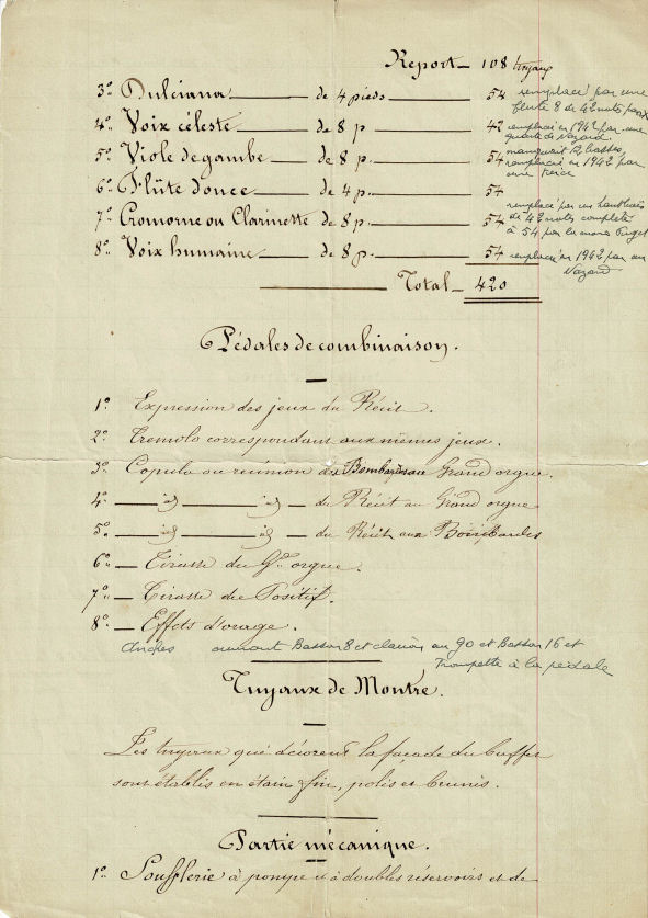 On a ensuite procédé à la vérification des différents jeux, en suivant l'ordre indiqué au devis, et en faisant entendre toutes les notes de chaque registre. Dans cet examen nous avons remarqué la plus parfaite homogénéité dans la mise en harmonie et dans la bonne qualité des différents timbres propre à chaque jeu. L'accord de tous les jeux de l'orgue dans leurs détails et dans leur ensemble ne laisse absolument rien à désirer.