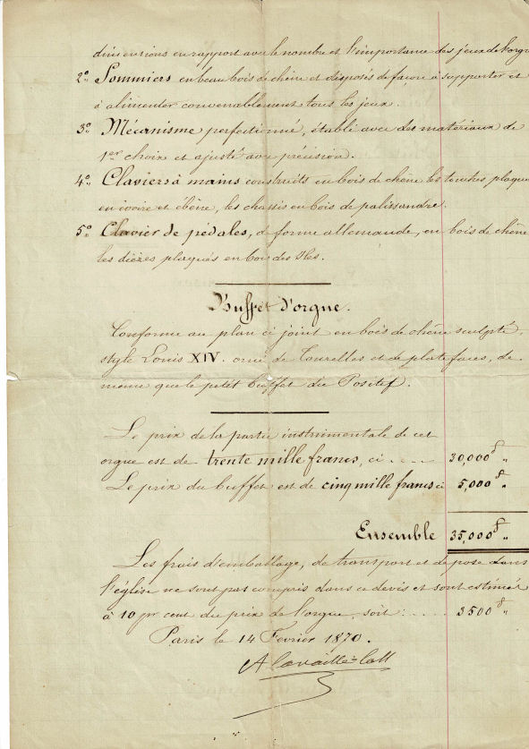 Pour trouver un compromis avec un orgue qui soit assez grand pour bien remplir la nef mais pas trop cher compte-tenu des finances disponibles, Cavaillé-Coll propose, dans un troisième devis daté du 14 février 1870, une très belle occasion.