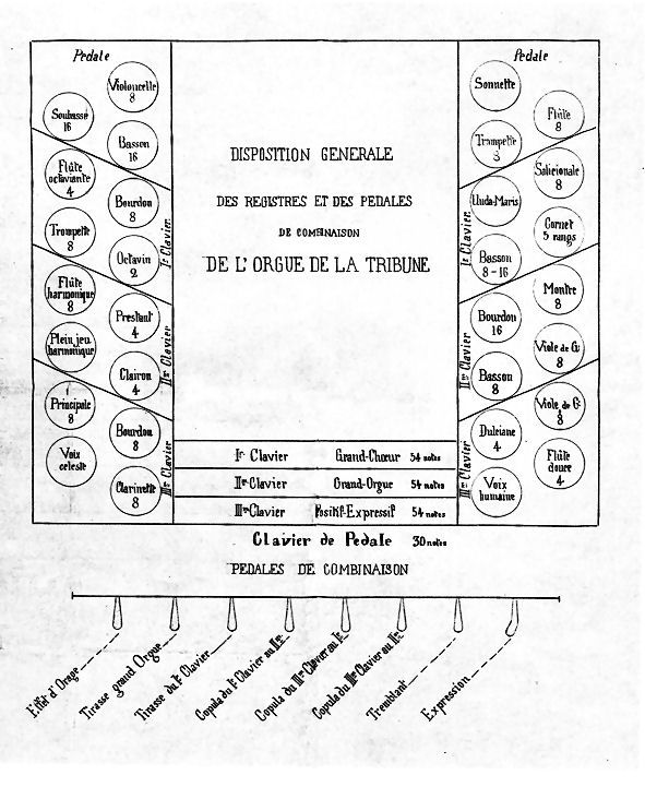 Le mécanisme général de l'orgue, claviers à la main et au pédalier, les abrégés, les leviers en bois et en fer, les pilotes tournants des registres et les pédales de combinaisons sont établis en beaux matériaux et fonctionnent avec une merveilleuse perfection.